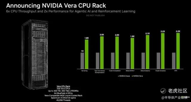 Vera CPU的定位是大规模数据处理、AI 训练和智能体推理场景,其效率是传统机架式CPU 的两倍,速度提升50%。