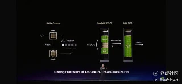 两种处理器的统一:LPU + Vera Rubin。“我们想出了一个绝妙的主意,”黄仁勋解释道,“我们将推理过程完全重新架构。我们把适合Vera Rubin的工作放在Vera Rubin上,然后把解码生成、低延迟、带宽受限的部分卸载到LPU上。”