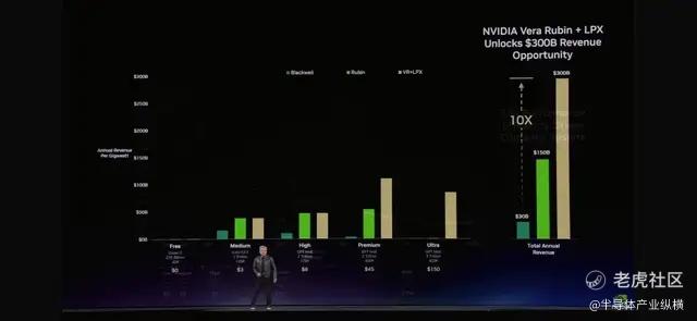 “就像任何行业一样,"黄仁勋解释道,"更高的质量,更高的性能,更低的容量。Grace Blackwell在你的免费层提升了巨大吞吐量,但在你最能变现的层级,它提升了35倍。Vera Rubin又在这个基础上提升了10倍。