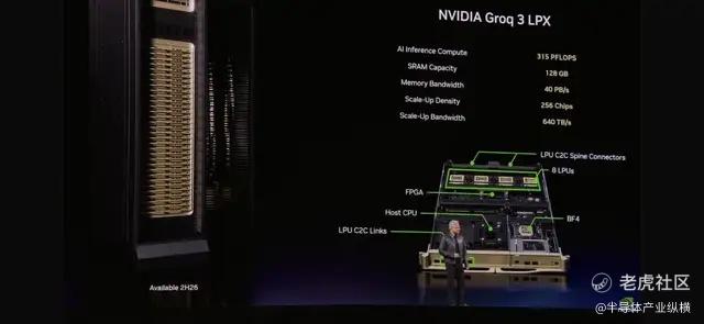 英伟达构建了包含256个Groq 3 LPU的Groq 3 LPX机架。该机架提供128GB的SRAM和40 PB/s的推理加速带宽,并通过每个机架640 TB/s的专用扩展接口将这些芯片连接起来。
