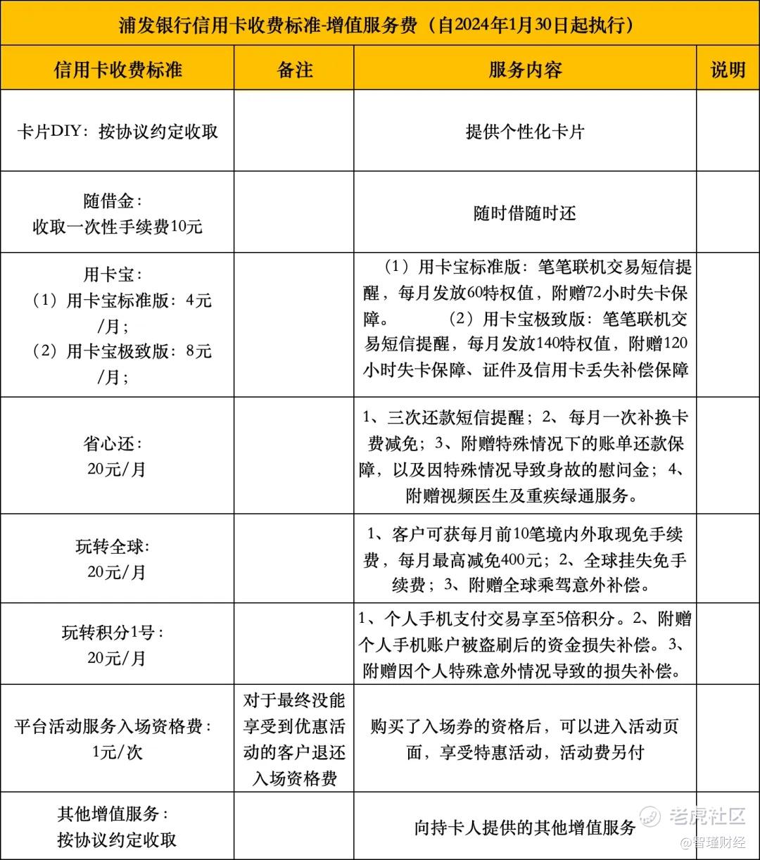 开甲财经注意到,浦发银行披露的信用卡收费项目表显示,该行自2024年1月30日起执行的增值服务费包括8类,具体收费项目如下: