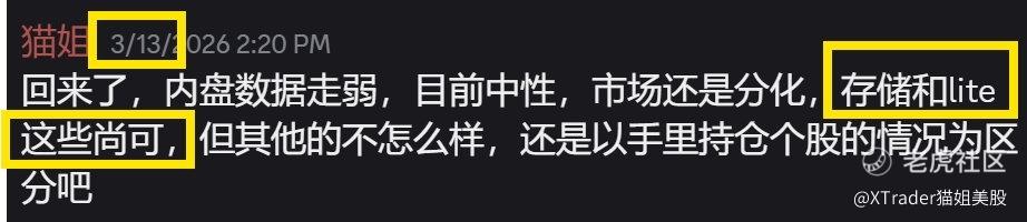 {"i18n":{"language":"zh_CN"},"detailType":1,"isChannel":false,"data":{"magic":2,"id":543677061501528,"tweetId":"543677061501528","gmtCreate":1773720192914,"gmtModify":1773720196649,"author":{"id":4145582440589970,"idStr":"4145582440589970","authorId":4145582440589970,"authorIdStr":"4145582440589970","name":"XTrader猫姐美股","avatar":"https://static.tigerbbs.com/0ba9fe0809f7aa97ceefbe7d170d0c07","vip":1,"userType":1,"introduction":"","boolIsFan":false,"boolIsHead":false,"crmLevel":1,"crmLevelSwitch":0,"individualDisplayBadges":[{"badgeId":"3f8f4b8c193b4343a88817ce07587dbd-1","templateUuid":"3f8f4b8c193b4343a88817ce07587dbd","name":"星级创作者","description":"累计发表精华帖>=3(或有料帖>=10),且30天内发表过至少一篇精华帖(或4篇有料帖)并参与过评论","bigImgUrl":"https://static.tigerbbs.com/1866dcf97a73be1c330f85862546aedc","smallImgUrl":"https://static.tigerbbs.com/4f5c5fa8e2c7683bb5a7fce8753ee456","redirectLinkEnabled":1,"redirectLink":"https://www.laohu8.com/activity/market/2023/star-contributors/","hasAllocated":1,"isWearing":0,"stampPosition":0,"hasStamp":0,"allocationCount":1,"allocatedDate":"2026.03.05","individualDisplayEnabled":1,"backgroundColor":{"dark":"#675a37","tint":"#f9ebc2"},"fontColor":{"dark":"#ffffff","tint":"#ab7a0e"}}],"fanSize":866,"starInvestorFlag":false},"themes":[],"images":[{"img":"https://static.tigerbbs.com/2c1dd20f8c03ab57a6fefd4af69d65ab","width":"922","height":"200"}],"coverImages":[{"img":"https://static.tigerbbs.com/2c1dd20f8c03ab57a6fefd4af69d65ab","width":"922","height":"200"}],"title":"","html":"<html><head></head><body><p>周一看来目前美股情况仍然是上周五的情况,存储和光通信等较强 $SNDK。</p>\n<p>就目前资金支撑情况看,如果不跌破关键点位,应该要继续延续两周左右。</p><img src=\"https://static.tigerbbs.com/2c1dd20f8c03ab57a6fefd4af69d65ab\" tg-width=\"922\" tg-height=\"200\"></body></html>","htmlText":"<html><head></head><body><p>周一看来目前美股情况仍然是上周五的情况,存储和光通信等较强 $SNDK。</p>\n<p>就目前资金支撑情况看,如果不跌破关键点位,应该要继续延续两周左右。</p><img src=\"https://static.tigerbbs.com/2c1dd20f8c03ab57a6fefd4af69d65ab\" tg-width=\"922\" tg-height=\"200\"></body></html>","text":"周一看来目前美股情况仍然是上周五的情况,存储和光通信等较强 $SNDK。 就目前资金支撑情况看,如果不跌破关键点位,应该要继续延续两周左右。","highlighted":1,"essential":1,"paper":1,"likeSize":0,"commentSize":0,"repostSize":0,"favoriteSize":0,"link":"https://laohu8.com/post/543677061501528","repostId":0,"isVote":1,"tweetType":1,"viewCount":125,"commentLimit":10,"likeStatus":false,"favoriteStatus":false,"reportStatus":false,"symbols":[],"verified":2,"subType":0,"readableState":1,"langContent":"CN","currentLanguage":"CN","warmUpFlag":false,"orderFlag":false,"shareable":true,"causeOfNotShareable":"","featuresForAnalytics":[],"commentAndTweetFlag":false,"andRepostAutoSelectedFlag":false,"upFlag":false,"length":126,"optionInvolvedFlag":false,"xxTargetLangEnum":"ZH_CN"},"commentList":[],"isCommentEnd":true,"isTiger":false,"isWeiXinMini":false,"url":"/m/post/543677061501528"}