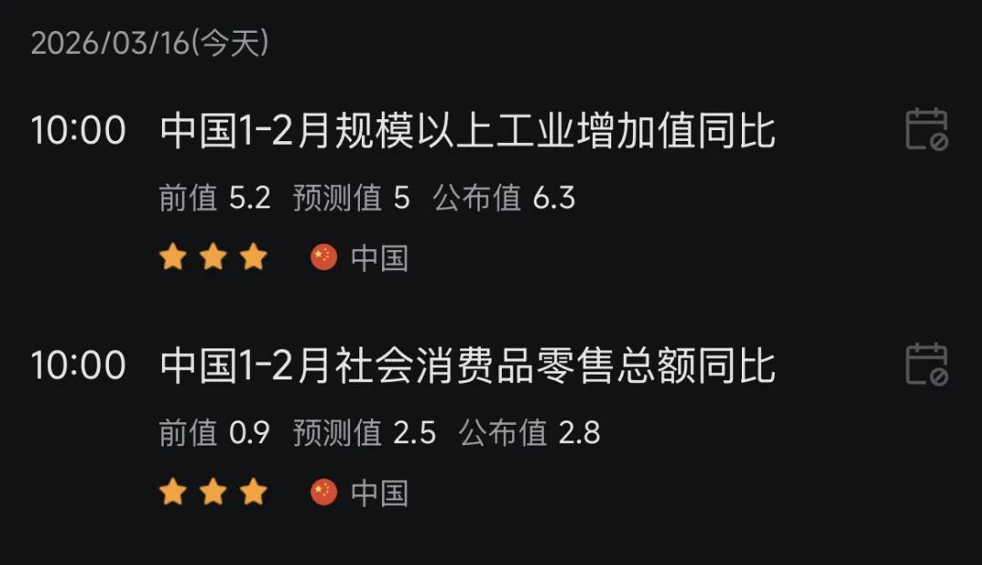 一切都是随它去的心态,能涨就涨,不涨就拉倒,我有的是时间,耗不死我。......1. 消费数据超预期1-2月,中国社会消费品零售总额同比增长2.8%,规模以上工业增加值增长6.3%,固定资产投资增长1.8%,增幅均好于预期。结合上次公布的CPI数据来看,中国开年的消费复苏还是很不错的,今年作为十五五规划的第一年,政策应该不会太弱,如能结束通缩,那股市前景确实值得期待。