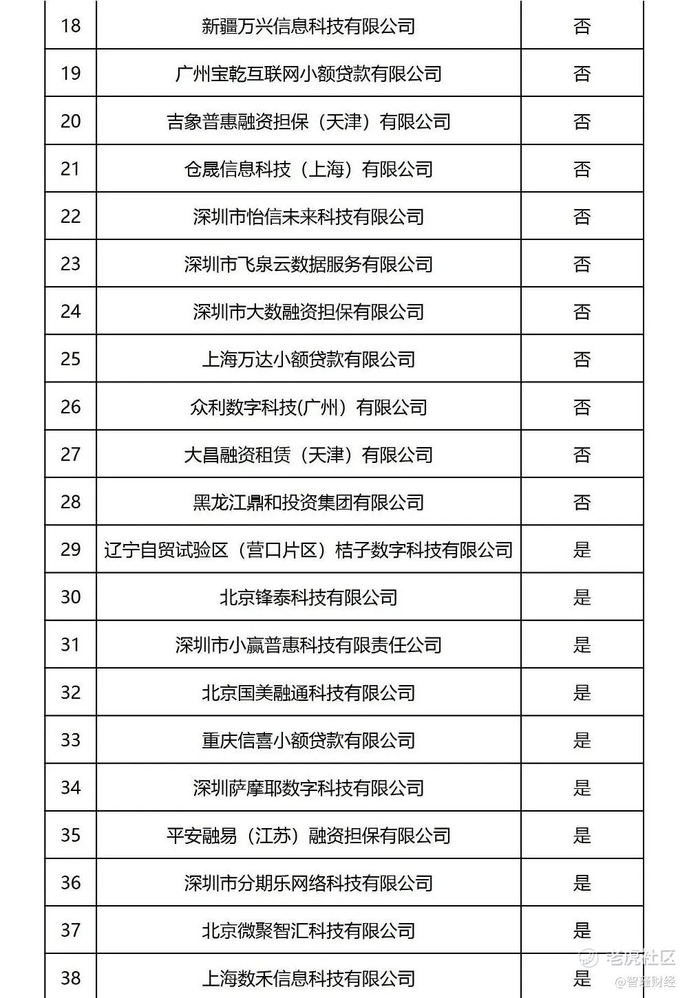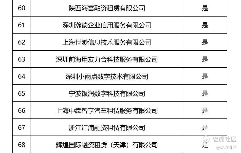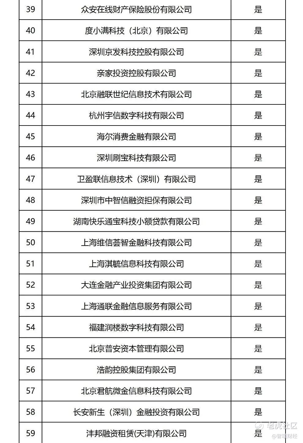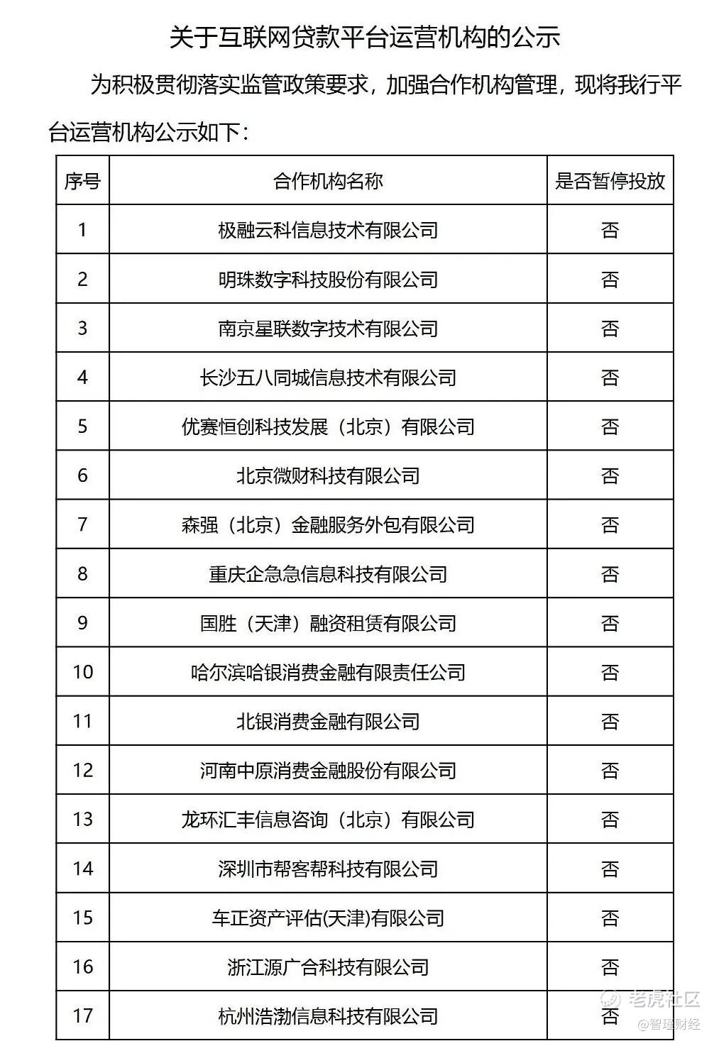 正常投放的有28家机构,包括极融、五八同城、微财等助贷平台;哈银消金、北银消金等持牌消金公司;宝乾小贷、万达小贷、吉象普惠融担、大数融担、大昌融资租赁、国胜融资租赁等持牌地方金融机构;