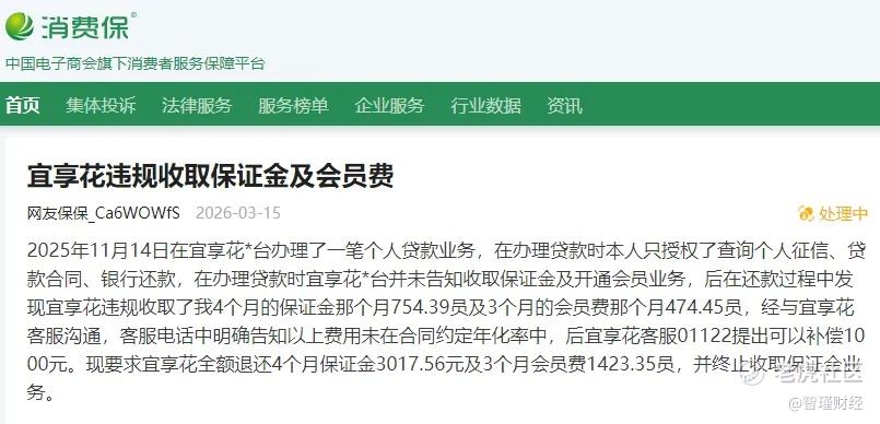 3月15日,一用户在消费保平台投诉宜享花,称其于2025年11月14日在宜享花平台办理了一笔个人贷款业务。办理时,宜享花并未告知会收取保证金及开通会员业务,还款过程中该用户却发现宜享花违规收取了4个月的保证金(每月754.39元)和3个月的会员费(每月474.45元)。与客服沟通,却被告知以上费用未在合同约定年化率中。