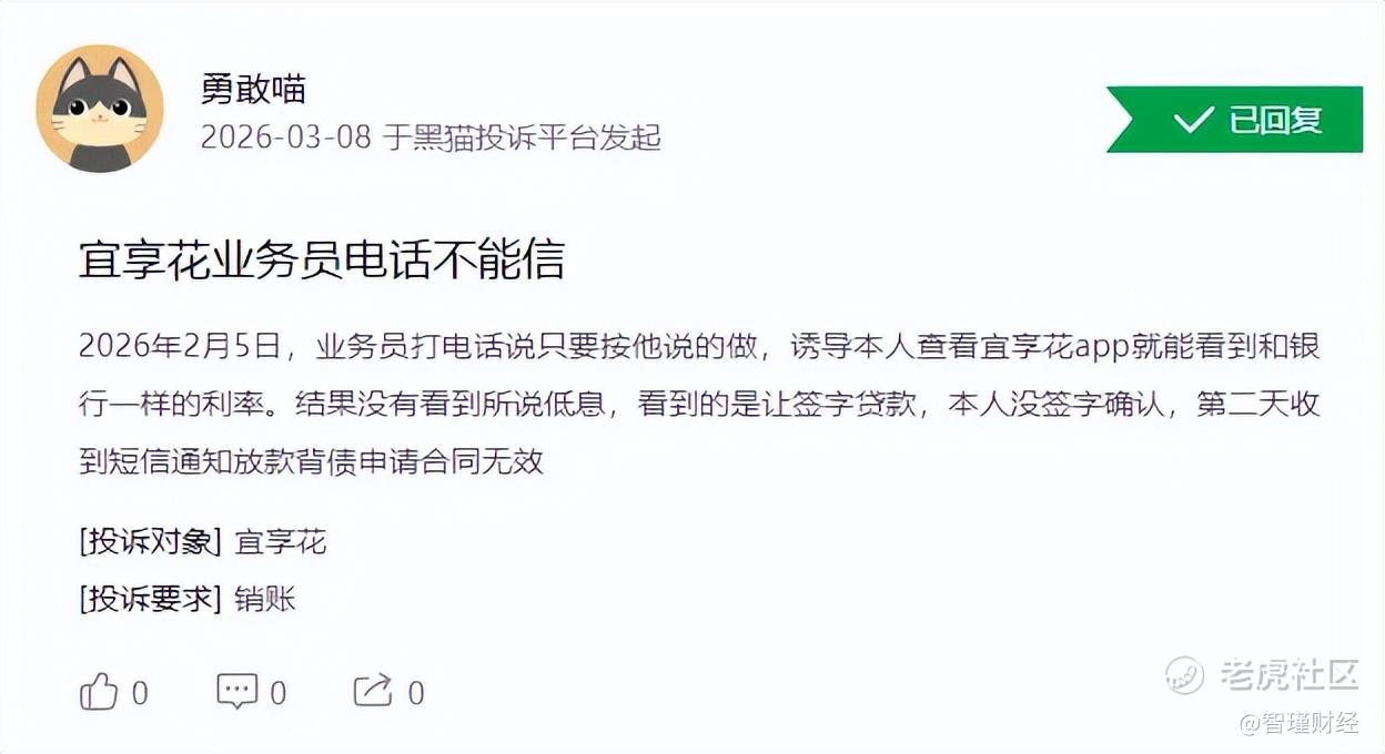 营销宣传方面,3月8日一用户投诉称,自己在今年2月5日收到了宜享花业务员的电话,业务员告诉该用户,登录宜享花APP就能看到和银行一样的低利息。该用户登录后并未看到所谓的低息,只看到了签字贷款的页面。该用户没有签字确认,第二天却依然收到了放款通知短信。