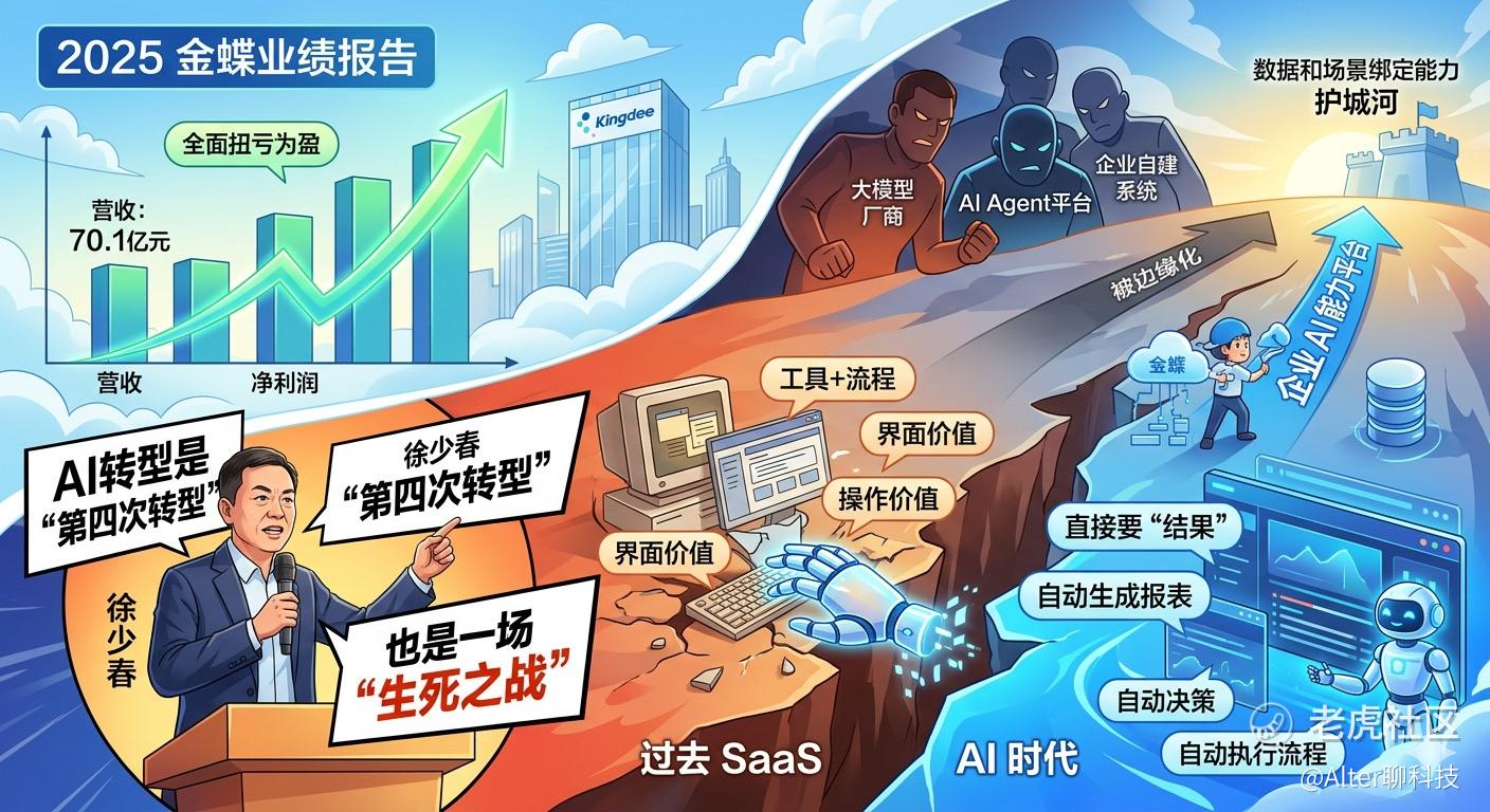 金蝶公布2025年业绩,实现营收70.1亿元、全面扭亏为盈,同时徐少春在发布会上直言,AI转型是公司历史上的“第四次转型”,也是一场“生死之战”。