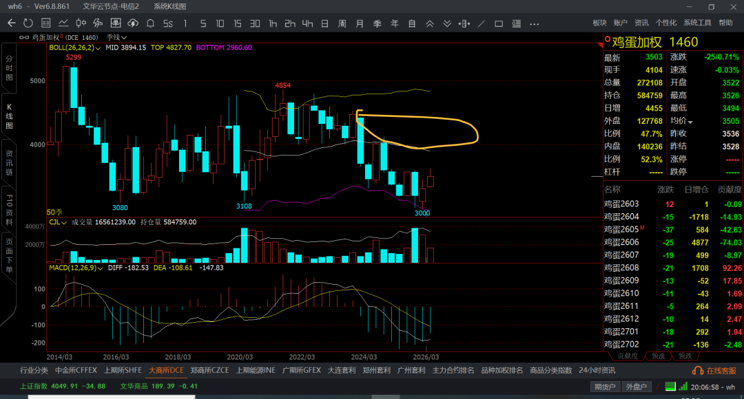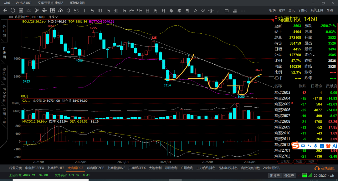 鸡蛋稍微还是好点,之前预计的是3.5-2.5的底部区域,未来怎么都是会爆仓在3.5-4.5的价格了,但一直都被压制在3.5附近,不过也不差,你在低位吸筹了,走高就t一波,那么这中间的差价也不算好了,继续按之前的策略来做,这部分都是配置模式,虽然赚的不多,但重在稳定和安全,不需要花费什么心思就能获利不少了。