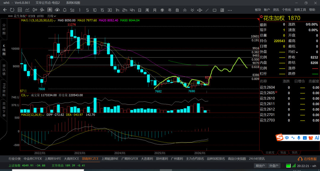 花生的基本面生产成本从之前的6k慢慢的提高到7k多,现在都在8k附近了,现在花生的价格还是在这个附近,自然是不对的存在了,叠加货币超发,同时还有其他地缘政治冲突,提高了生产成本,同时叠加未来动乱起来,需求端口会爆涨,自然是供应少了而需求多了,那么有个三五十的一家算是正常的吧,但大于一倍的难度就比较大了。