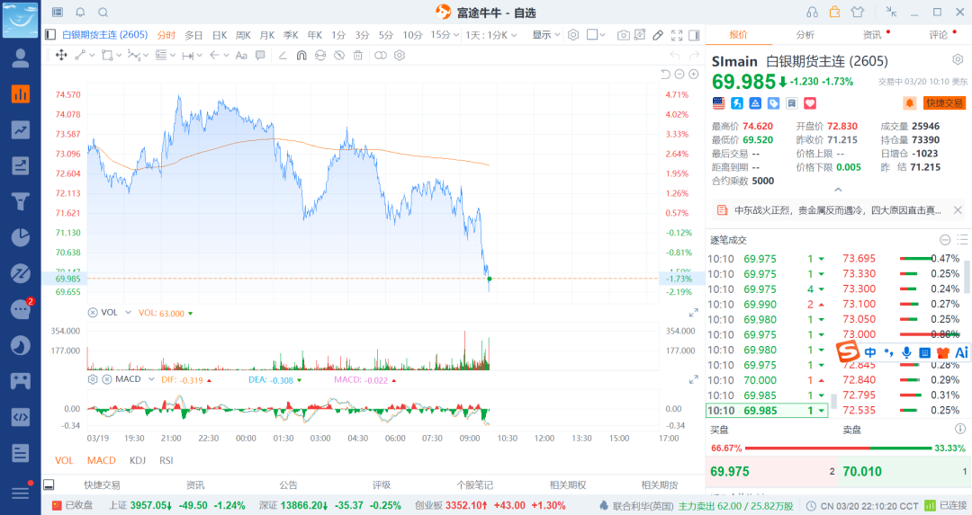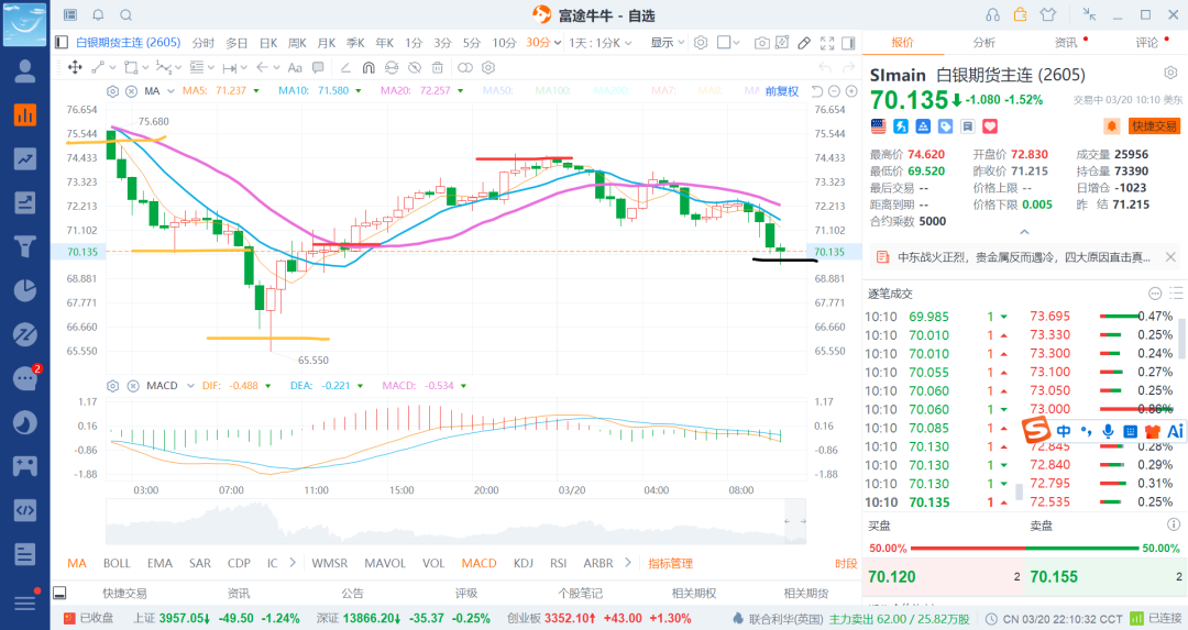 ai量化大模型的市场下,没机会的时候是真么机会啊,怎么做都不行,当然了机会来了的时候,又是真的太多了,一天都好几个来回,要是没策略,战略布局都会被他玩死了,好在继续按策略做就是了,白银昨天大跌,今天超跌反弹到75附近后又又开始震荡下来了,那么自然就是低吸起来即可。