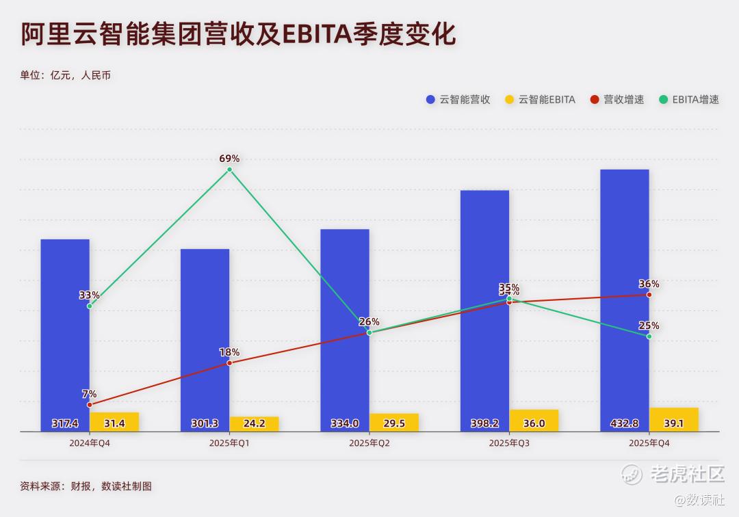 四季度,阿里的云智能业务营收433亿元,同比大幅增长36%,增速仅次于即时零售。这项业务的利润回报也是丰厚的。经调整EBITA为39亿元,同比大幅增长25%。财报中,对于净利润的下滑,阿里提到,云业务的增长,带来经营业绩改善,一定程度上抵消了即时零售等投入带来的利润下滑。