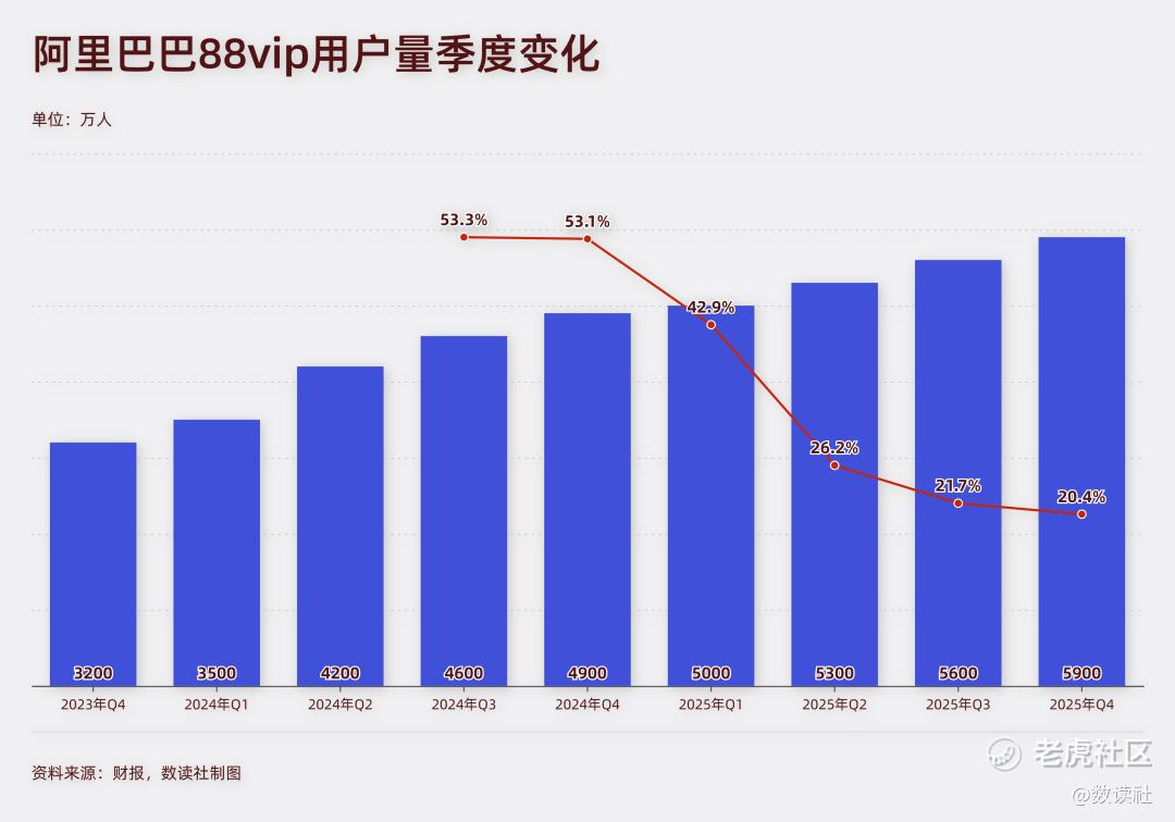 2025年,阿里不仅对饿了么进行了大动作,还尝试性将盒马引入88vip会员权益,得到的效果依然不直观。四季度,88vip会员数量为5900万人,同比增长约20.4%。无论是增量还是增速,都已经无法与过去相比。