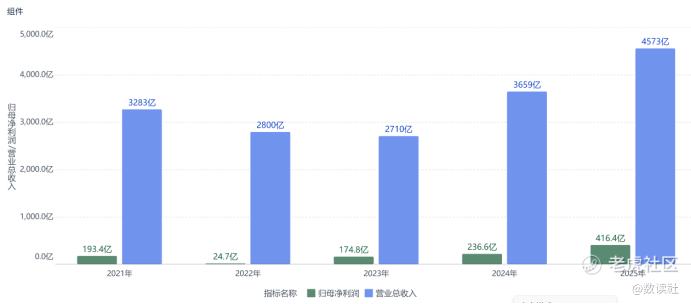 2021-2025年总收入分别为3283亿元、2800亿元、2710亿元、3659亿元、4573亿元,连续三年增长。