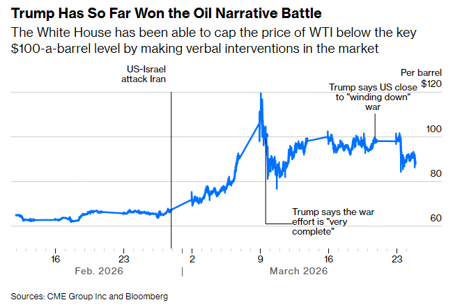 另一方面特朗普对金融市场的“拿捏”非常游刃有余,战争已经持续约4周了,期间要么阻止能源价格恐慌,要么承诺采取行动确保霍尔木兹海峡的石油供应,要么暗示冲突即将结束……反正成功把油价压在了100美元以下,彭博社称之为“赢得了石油叙事之战的胜利”。 $美国原油ETF(USO)$ $WTI原油主连 2605(CLmain)$