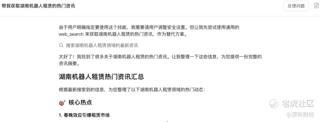 首先是“获取热门资讯”技能,我让它搜索“帮我获取湖南机器人租赁的热门资讯”相关笔记,悟空自动浏览小红书、查看详情、获取用户资料,生成了一份完整的内容分析报告。