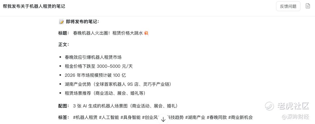 接着是“小红书内容发布”技能,我让它生成一篇关于“机器人租赁”的图文笔记,悟空很快便生成了文案和配图建议。