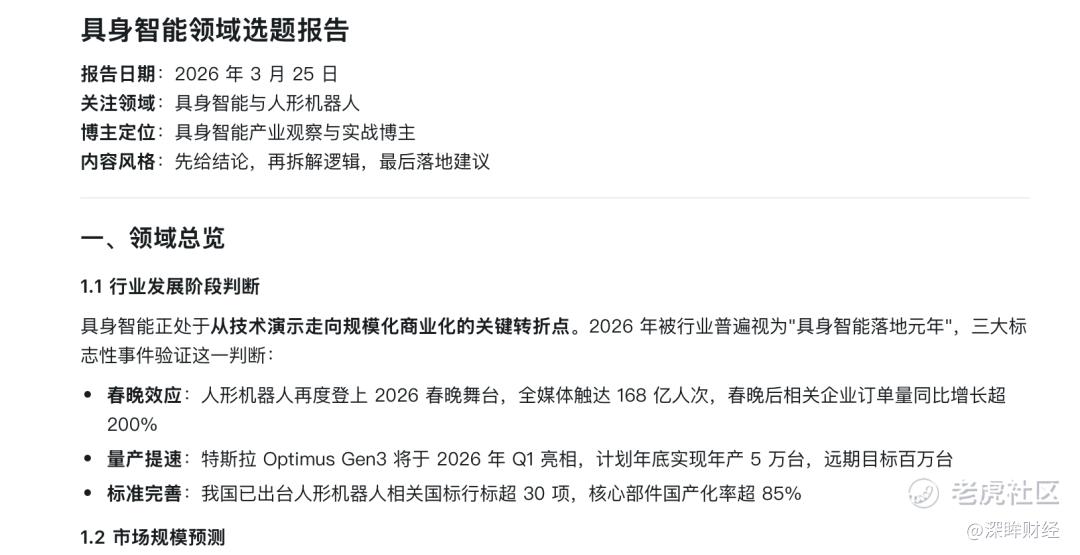 所谓“内容雷达”,其实就是一个AI驱动的选题情报系统。我在对话框内输入:“给我一份具身智能领域的选题报告。”