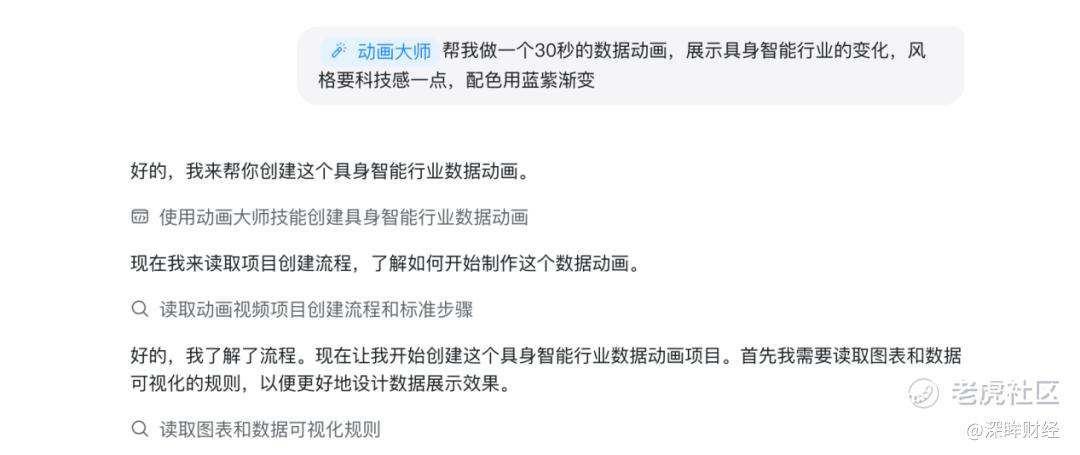 我用自然语言描述:“帮我做一个30秒的数据动画,展示具身智能行业的变化,风格要科技感一点,配色用蓝紫渐变。”
