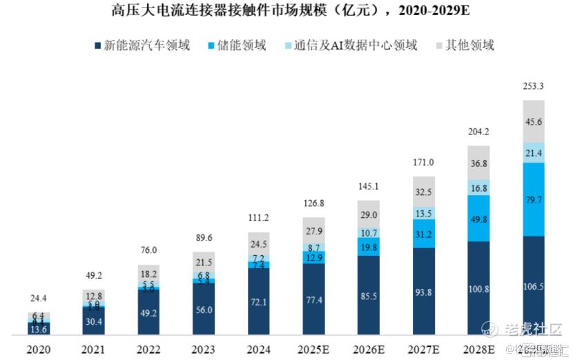 根据弗若斯特沙利文的统计,2024年中国高压大电流连接器接触件市场规模为111.2亿元,预计2029年中国高压大电流连接器接触件市场规模可增长至253.3亿元,2025年至2029年的复合增长率达到18.9%,主要的增长来源于新能源汽车、储能、通信及AI数据中心下游市场需求。