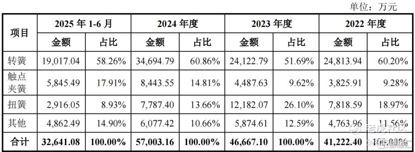 按照产品类别划分,公司主营业务收入结构基本稳定。报告期内转簧类产品销售收入占当期主营业务收入的比例最高,均在50%以上。