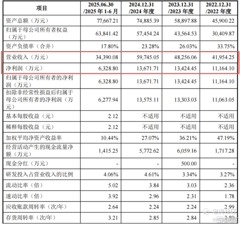 2022年、2023年、2024年及2025年1-6月(报告期),公司营业收入分别为4.2亿元、4.83亿万元、5.97亿元及3.44亿元,归母净利润分别为1.11亿元、1.34亿元、1.37亿元及6328.8万元。