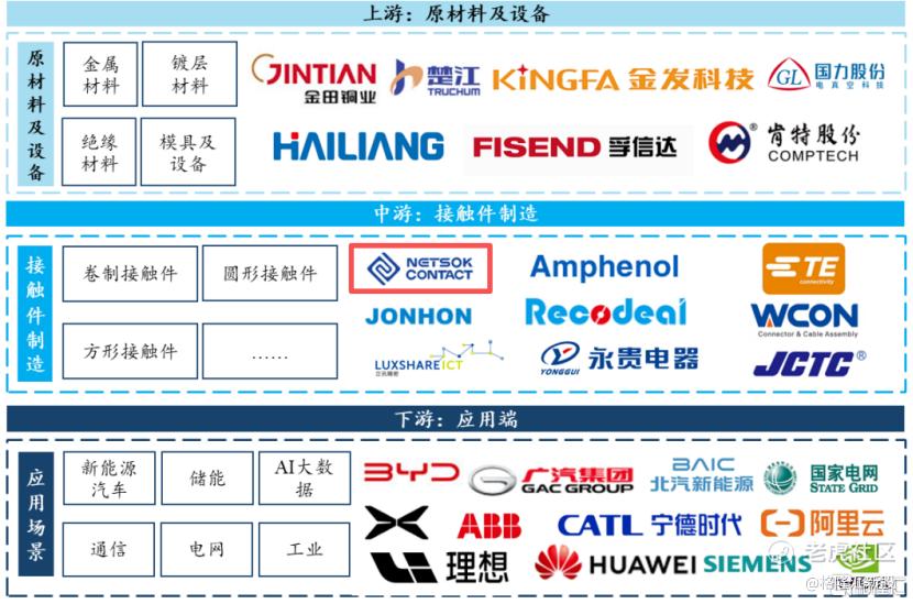 高压大电流连接器接触件是高压设备大电流传输中的关键传导零部件,上游为基础材料及设备领域,下游为高压大电流连接器和系统集成,以及最后在新能源汽车、储能、通信及AI数据中心等终端领域应用。