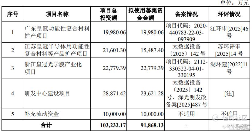 本次IPO,公司拟使用募集资金约9.19亿元,用于广东皇冠功能性复合材料扩产项目、江苏皇冠半导体用功能性复合材料等产品扩产项目、浙江皇冠光学膜产业化项目、研发中心建设项目、补充流动资金。