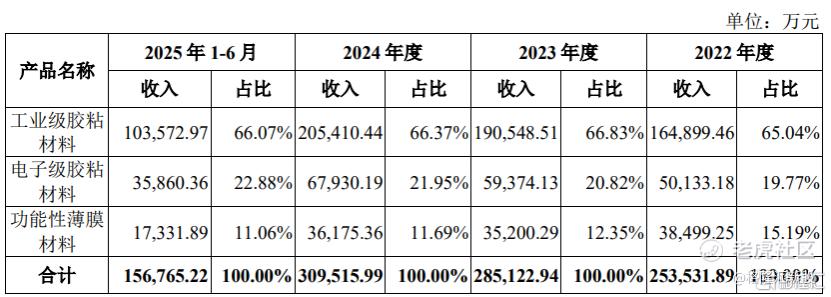 具体来看,2022年至2025年1-6月(简称“报告期”),工业级胶粘材料为公司贡献了65%以上的营收,电子级胶粘材料的营收占比在20%左右,功能性薄膜材料的营收占比从约15%降至11%。