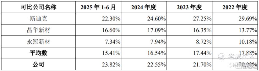 报告期内,皇冠新材的综合毛利率分别为20.02%、21.7%、22.55%和23.82%,其毛利率水平高于同行业上市公司平均值。