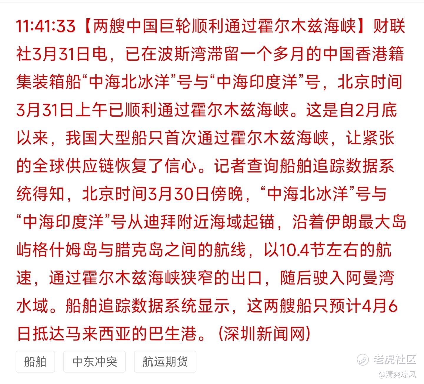 首先,海峡并未真正“关闭”。伊朗外交部明确表示,海峡对非敌对国家的船只开放。3月31日,两艘中国籍超大型集装箱船已成功穿越海峡驶出波斯湾,航运监测数据亦显示至少20艘船只在3月28日后完成通航。