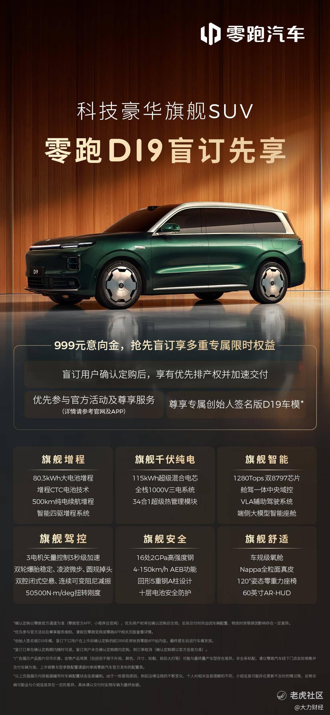 “真旗舰,见真章”,零跑旗舰 D 平台的首款车型——零跑D19将于4月16日正式上市。目前盲订权益仍在进行中,用户支付999元意向金,确认定购后可享优先排产权、加速交付、优先参与官方活动及尊享服务,并可获得专属创始人签名版D19车模(限量2000名)。
