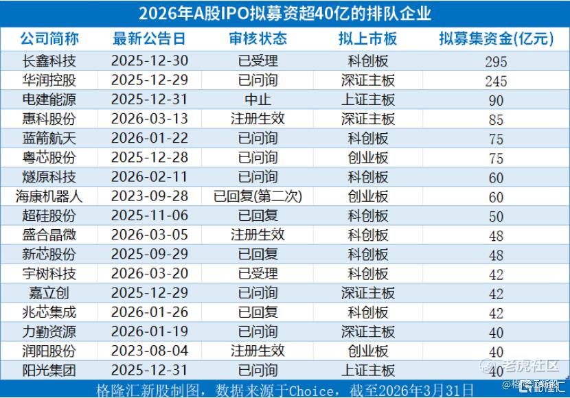 目前,A股注册制下仍有300多家在审企业(文末附各版块详细IPO排队名单),尤其是曾在春晚惊艳亮相的机器人公司宇树科技也在今年3月正式向科创板递交招股书,还有长鑫科技、华润控股、蓝箭航天、海康机器人等备受关注的大型IPO。