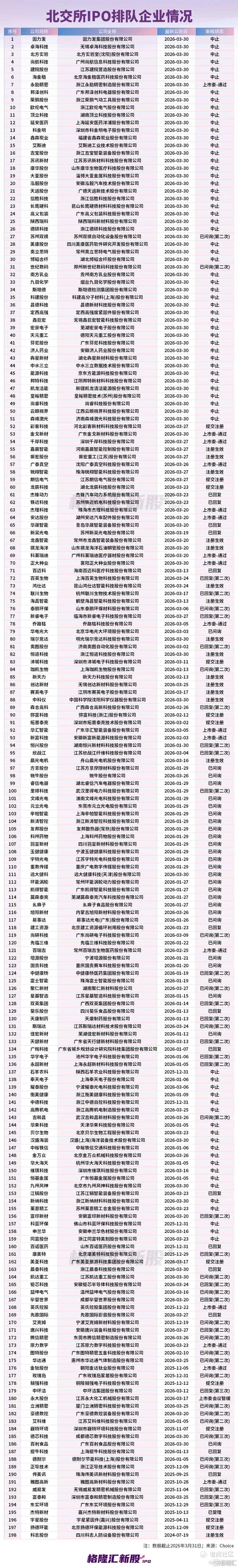 从已经正式递交招股书的企业来看,Choice数据显示,截止2026年3月31日,剔除IPO终止、审核不通过、不予注册的企业之外,A股注册制下在审企业为337家。其中,沪主板、深主板均为22家,科创板、创业板分别为48家、47加,北交所则高达198家。