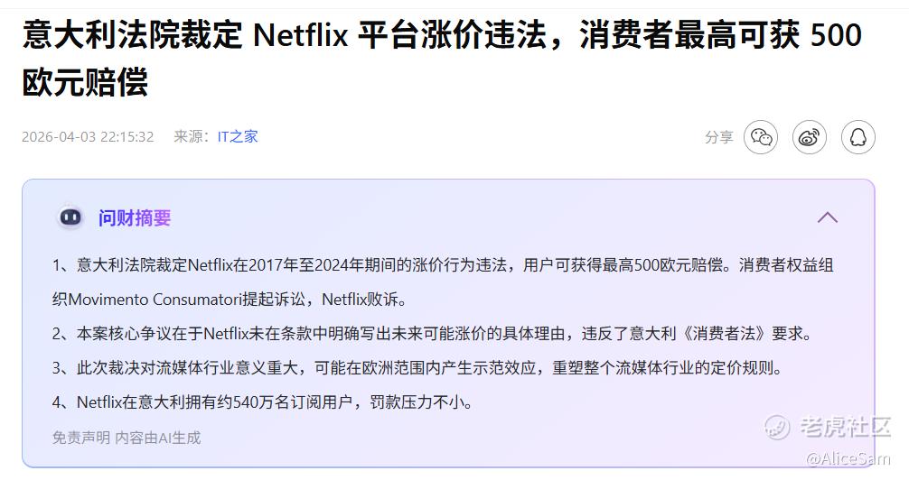 这不,拿来休闲看戏的 $奈飞(NFLX)$ ,也宣布要涨价了。别人要涨,我都能理解,因为成本真的在上升,可能需要加一点,才拉平一下。但是,奈飞不是刚拿到一笔巨额的分手费吗,手里一大笔钱啊,要知道他们此次涨价,是发生在Netflix放弃收购华纳兄弟探索WBD工作室及流媒体业务一个月后。当时派拉蒙与天迭控股Skydance以每股 31 美元的整体报价竞购WBD,Netflix未跟进加价。华纳兄弟探索终止与 Netflix 的协议后,Netflix获得了28亿美元的交易解约赔偿金,手里刚拿到28亿美元,反手再宣布涨价,哎,真的是有点割韭菜了啊。[捂脸] 希望哪个国家再去裁定他涨价违法,赔给消费者们一些钱,或者取消涨价。[鬼脸]