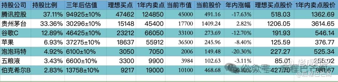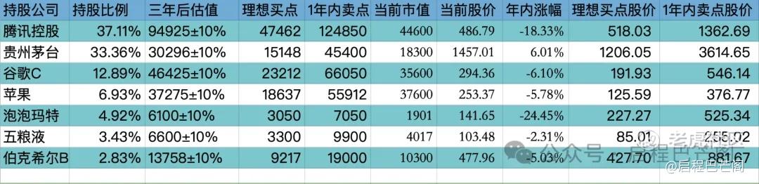目前十大持仓:腾讯37.11%,贵州茅台33.36%,谷歌12.89%,苹果6.93%,泡泡玛特4.92%,五粮液3.43%,伯克希尔2.83%。目前九大持仓占比88%(其中科技股占比56.93%,白酒股占比36.79%;A股占比36.79%,港股占比42.03%,美股占比22.65%),还有12%观察仓和现金。
