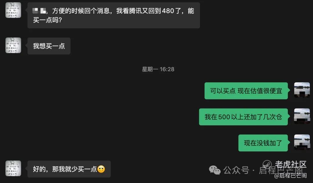 最近一个,好久没联系的前同事,突然给我发消息,问我480港币的腾讯能否买点?我说可以买啊,现在估值很低,我在500港币以上加仓了好几次。他回复说,那我也买点。然后也没聊太多,他之前也投资过腾讯。