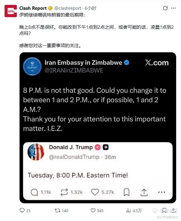 特朗普确实还在威胁扩大打击范围,之前也有关于能源、基础设施、甚至哈尔克岛的强硬表态;但今天公开层面的主导节奏已经转到最终期限 + 协议窗口。