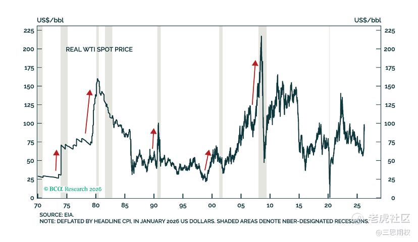 我们首先解释一下这个“通胀转衰退”的机制。叙事的前半段“通胀”不难理解,油价上涨带动通胀预期上升导致中央银行货币政策空间受限,经济增速放缓。但是,如果中东局势迟迟无法太平,让油气季度平均价达到了我们上一篇公开文章中所说的最坏情景,且高价维持时间足够长。那么,AI和所有宏观经济学课本会告诉大家一个最可能的答案:油价高企持续足够长的时间→企业利润率遭到实质性压缩→消费者实际购买力持续下降→信贷条件收紧→经济活动收缩的衰退宏观数据开始出现。