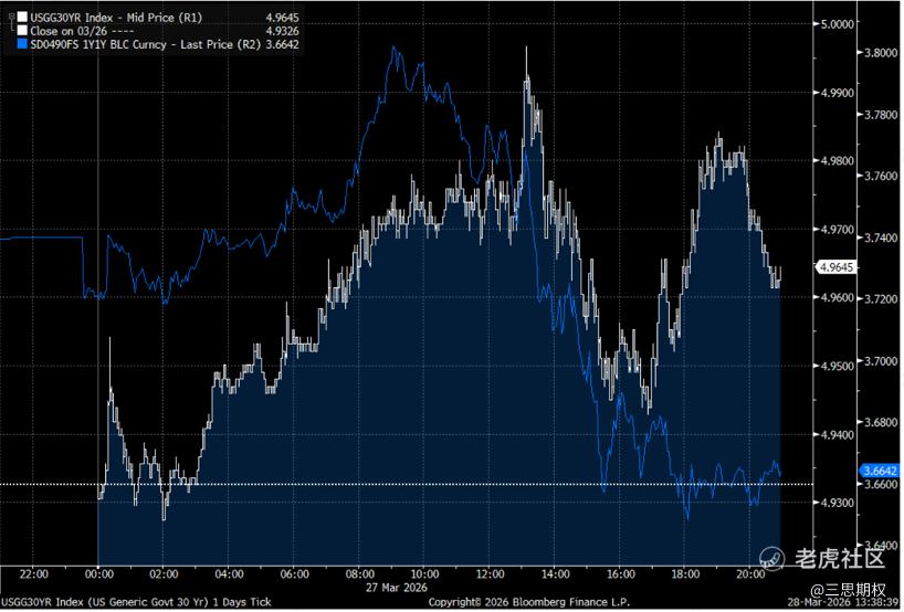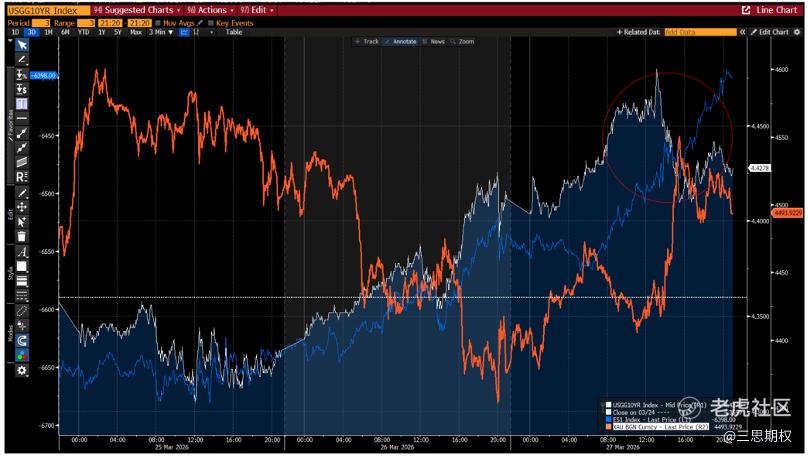 三月底这一周的一个有趣变化是周五利率突然毫无征兆地下行,而且是在美股下跌的过程中。这是开战后接近4周以来第一次出现。下图是3月25-27日美债利率(白线)、美股(反转,蓝线)以及黄金(橘线)。这个反转出现在伦敦交易时间中午左右。其实开战之后,美股和美债的走势基本趋于一致,即股/债/金齐跌。但3月27日周五中午这个趋势在没有任何新闻的情况下反转:美股持续下跌(蓝线反转持续上涨),美债收益率开始走低,同时黄金开始明显反弹。