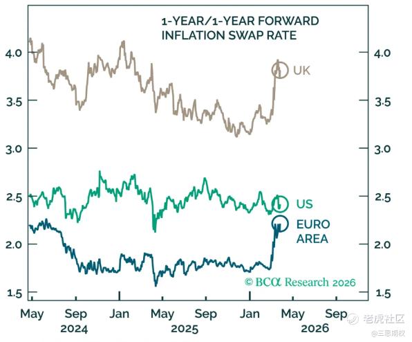 美国的通胀期限结构近端急升,但远端锚定。这是一个典型的"供给侧外生冲击"的市场定价特征,并未出现"通胀预期脱锚"的迹象。下图中三个地区都出现了明显的短端通胀重新定价(深色和浅色柱),但注意最右边那根几乎贴地的柱子——5y5y远期通胀预期。美国的5y5y自开战以来变化实际上是负值(约-3bp),欧元区和英国也只有5-9bp。