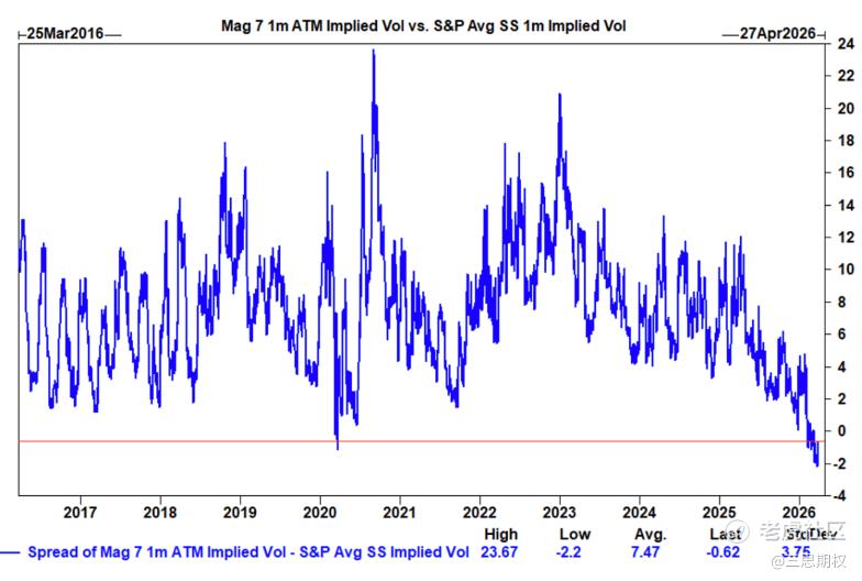 那么,目前市场对资本开支大户又是怎样的心态呢?如果看股票期权的隐含波动率,Mag 7的隐含波动率现在低于标普500普通股的平均水平。历史极低值是疫情时候的负2.2,当前已非常接近(历史上这个差值平均为+7.47)。市场已经对Mag 7的尾部风险定价趋于麻木。期权市场认为Mag 7接下来一个月的波动不会比普通股更剧烈——这可能反映了投资者认为该跌的已经跌了,短期内没有更大的系统性冲击来源。