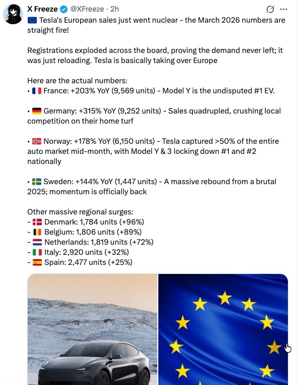 特斯拉在欧洲的销售最近反弹,表现非常强劲。FSD也将在今年晚些时候进入欧洲。