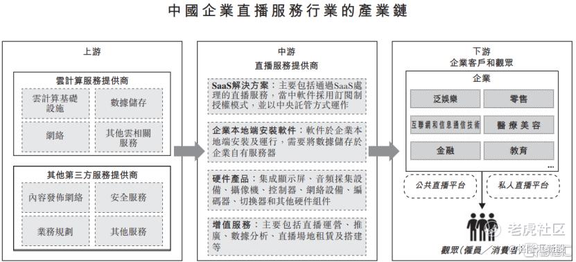 中国企业直播服务产业链上游包括云技术服务提供商及其他第三方服务提供商,参与者包括阿里云、腾讯云、**云、索尼、云犀等。