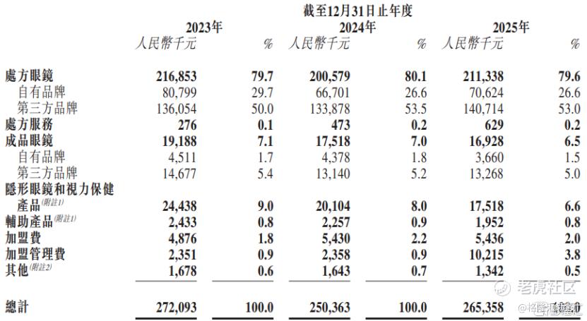 2023年、2024年及2025年(简称“报告期”),毛源昌眼镜销售处方眼镜的收入占收入的约80%,占比较大;处方服务、成品眼镜、隐形眼镜和视力保健产品、辅助产品、加盟费等业务收入占比较低。