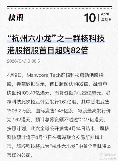 全球空间智能独角兽公司Manycore Tech群核科技(00068.HK)4月9日开启全球公开发售,券商数据显示,首日群核科技申购倍数超过82倍,融资申购额约100.47亿港元,而募资额为1.22亿港元。