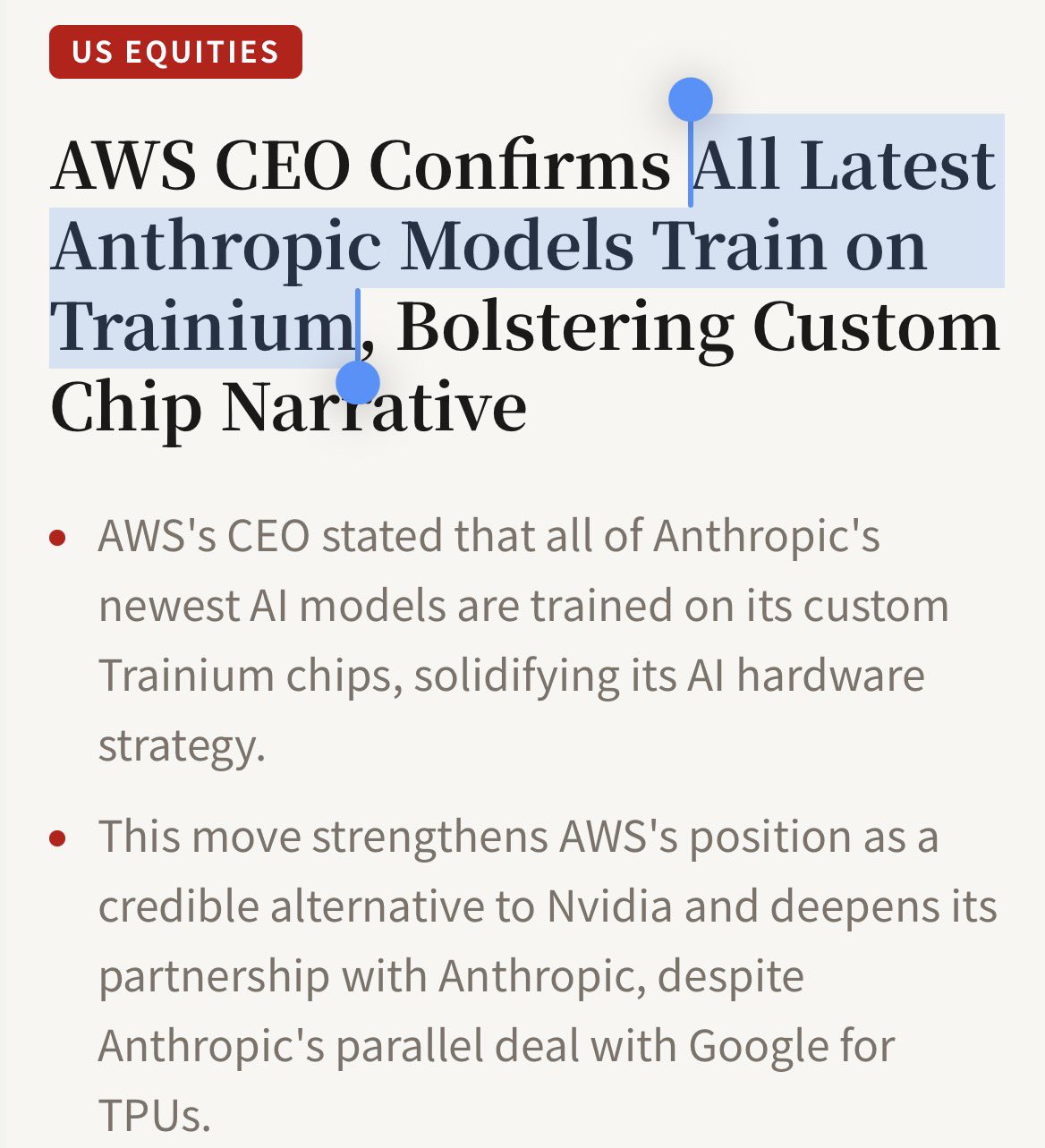 不过有人遭殃,就有人欢喜。Anthropic年化收入在一季度从90亿美元增长到了300亿美元,收入爆炸式增长的背后,真正的受益者们也开始浮出水面-周四 $亚马逊(AMZN)$ 收涨5.6%,AWS CEO表示Anthropic最新的模型全部都是用AWS自研芯片Trainium 训练的。(美银称:Anthropic的爆发式增长,正在“反哺”AWS。Anthropic的大部分算力跑在AWS上,Q1仅Anthropic就可能给AWS贡献+13亿美元收入,预计Q2还可以再贡献+10亿美元以上的增长。)