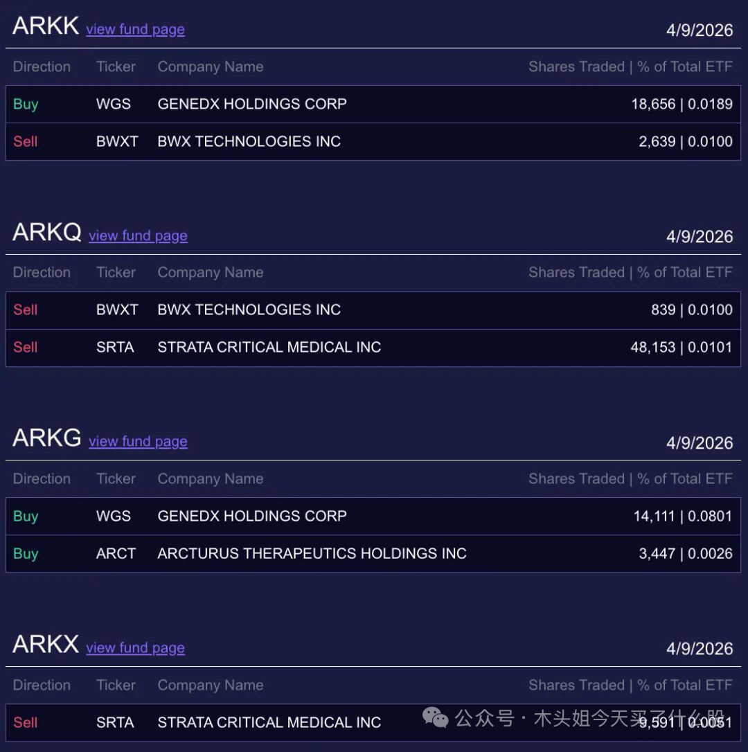 木头姐今天买入200万美元WGS、3万美元ARCT。