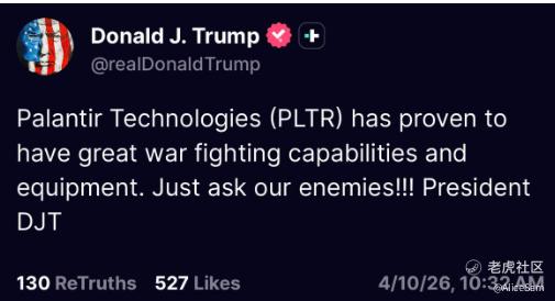 在当今成年人的世界里,如果不是代言费给的足够高,几乎很少有政治人物在公开社交平台上直接点名一家上市公司,或者使用战争与敌人作为叙述框架,更罕见的是明确写出股票代码 $Palantir Technologies Inc.(PLTR)$ 。这种明目张胆的广告,代言费毫无夸张地说,必然是天价!