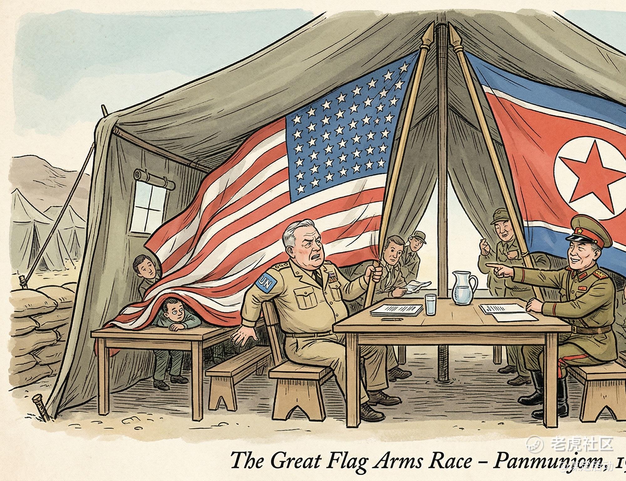 “谈判双方在桌子上摆放各自的旗帜。某天朝鲜方面拿来了一个比联合国军更大的旗子。美方不甘示弱,第二天拿来了一个更巨大的。这场“军备竞赛”一直持续到旗子大到连帐篷都快塞不下,最后双方才不得不达成妥协,严格规定了旗帜的标准尺寸。” ——摘自曾任朝鲜战争美方首任首席代表特纳·乔伊海军中将《朝鲜战争回忆录》