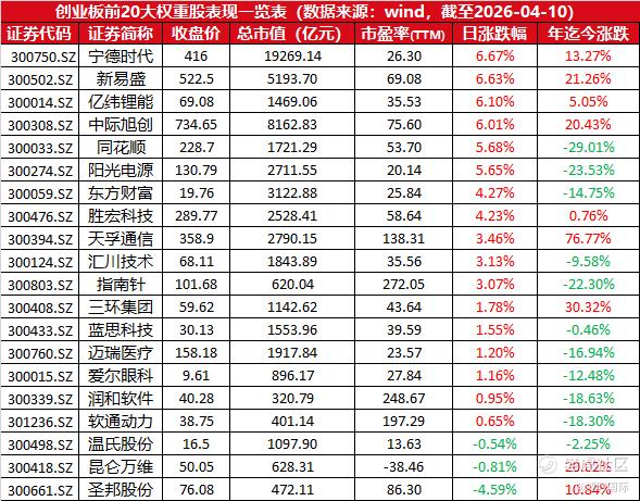 深市创业板前20大权重股表现一览表: